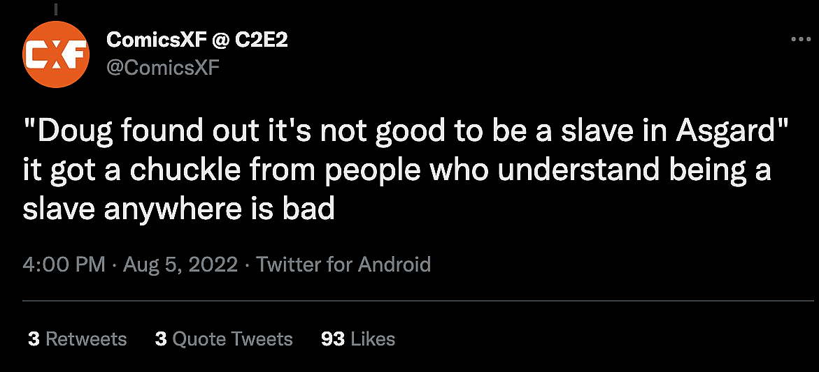 “’Doug found out it’s not good to be a slave in Asgard’ it got a chuckle from people who understand being a slave anywhere is bad,” tweeted ComicsXF, implying Claremont doesn’t understand slavery to be a bad thing; without providing any further evidence to back this non-sensical argument.