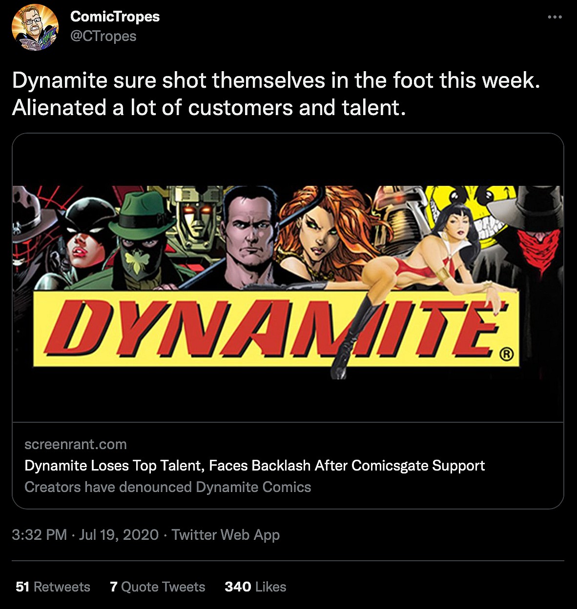 Comic Tropes tweeted ScreenRant’s lambasting article about ComicsGate, titled “Dynamite Loses Top Talen, Faces Backlash After Comicsgate Support,” asserting that the aforementioned publisher “sure shot themselves in the foot this week. Alienated a lot of customers and talent.”