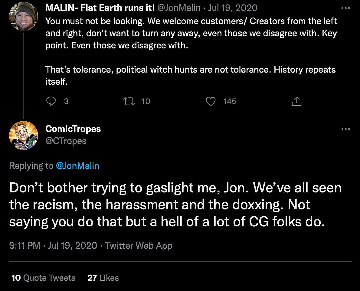 Comic Tropes then fired back, declaring, “Don’t bother trying to gaslight me, Jon. We’ve all seen the racism, the harassment and the doxxing. Not saying you do that but a hell of a lot of CG folks do.”