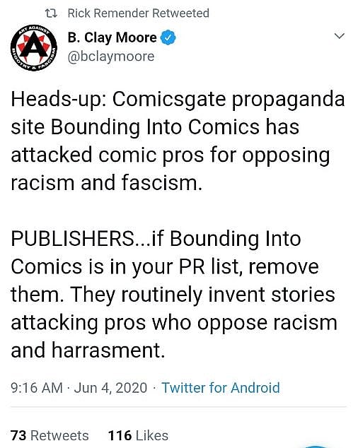 He wrote, “Heads-up: Comicsgate propaganda site Bounding Into Comics has attacked comic pros for opposing racism and fascism.”