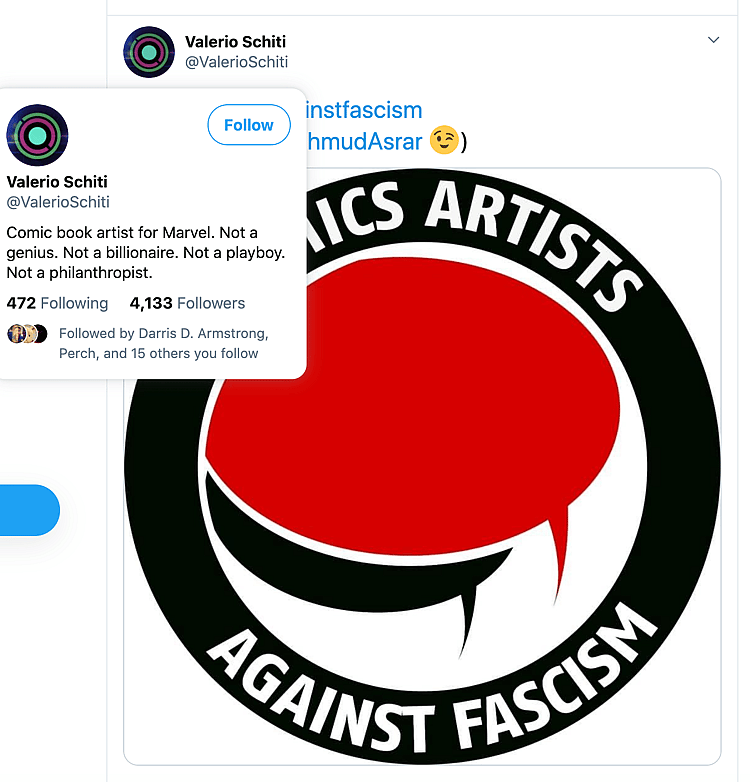 Valerio Schiti, who also recently appeared to support Antifa, retweeted Moore’s call to have publishers remove us from their press lists.