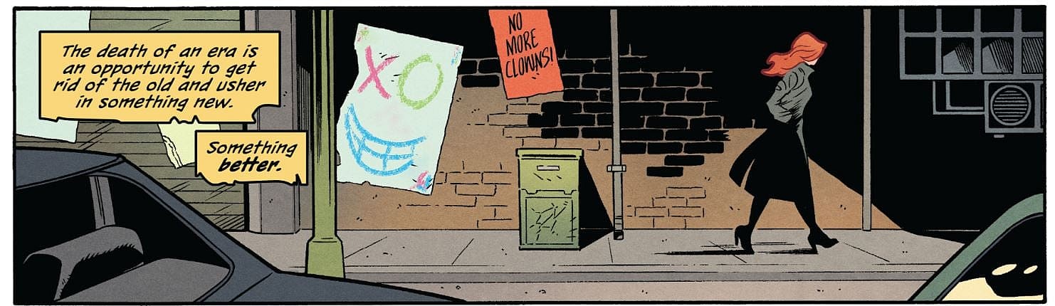 Babs finally gets up and leaves the diner. As she begins walking through Gotham, she joins in with what appear to be Gotham’s version of Antifa as they are tearing down statues and appear to have been launching projectiles in a protest.