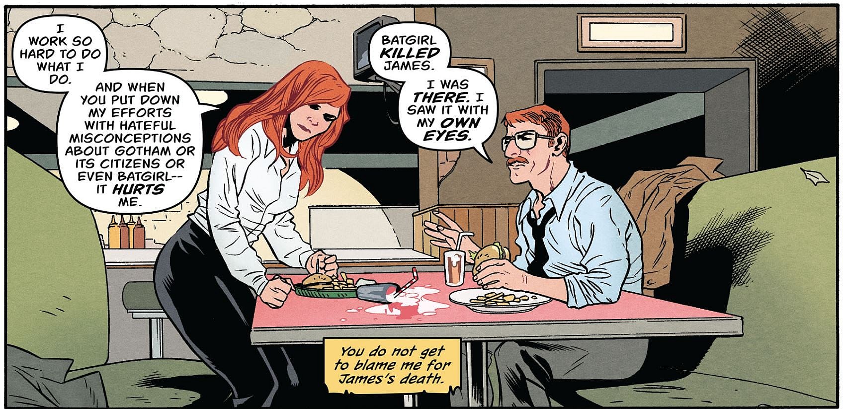 Following James Gordon’s funeral, Barbara takes her dad to an old diner where the two have burgers and shakes. During their meal, Jim Gordon advocates for a complete overhaul of Gotham.