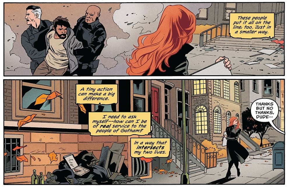 “These people put it all on the line, too. Just in a smaller way. A tiny action can make a big difference. I need to ask myself–how can I be of real service to the people of Gotham? In a way that intersects my two lives.”