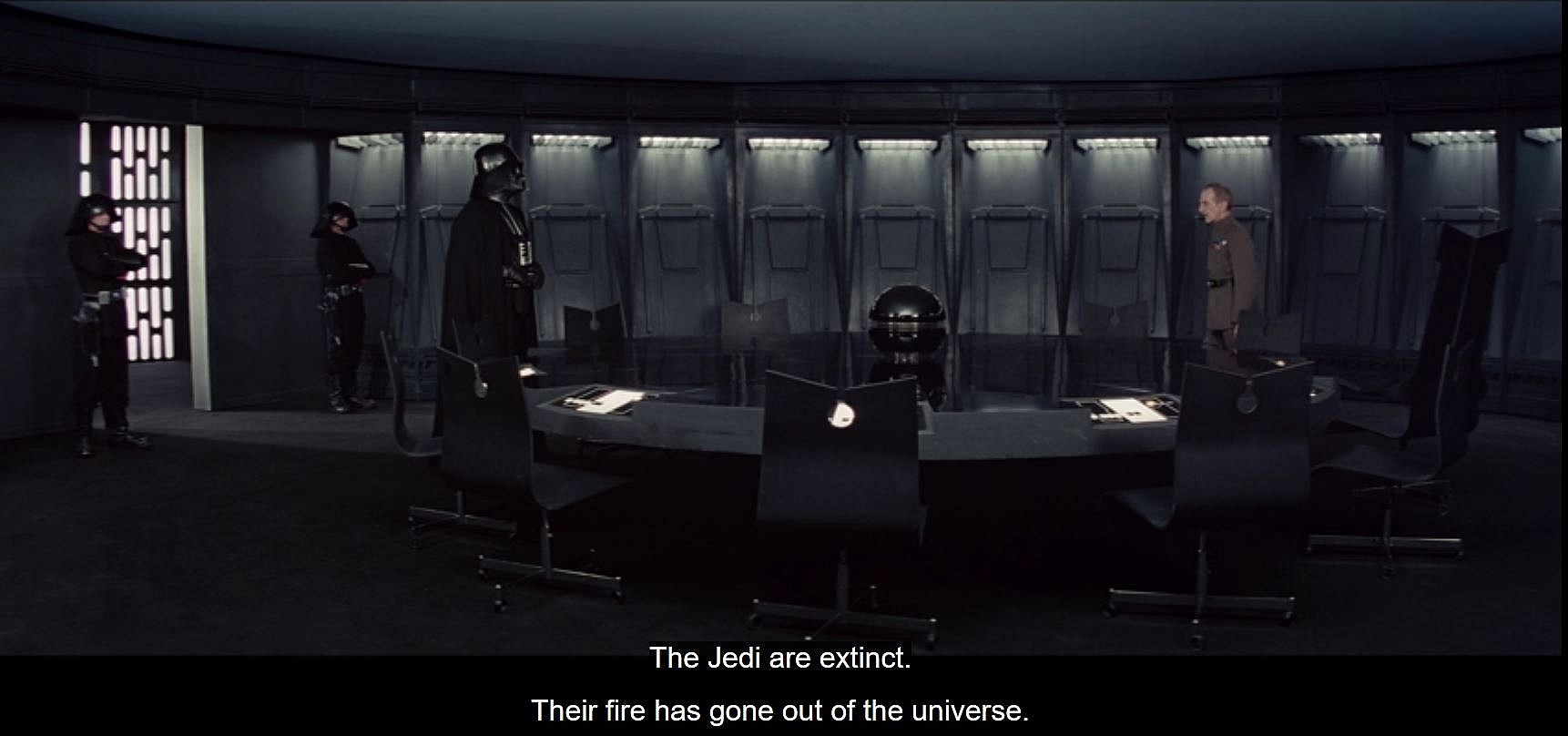 This idea would then be echoed by Grand Moff Tarkin who told Darth Vader, “The Jedi are extinct. Their fire has gone out of the universe. You my friend are all that’s left of their religion.”