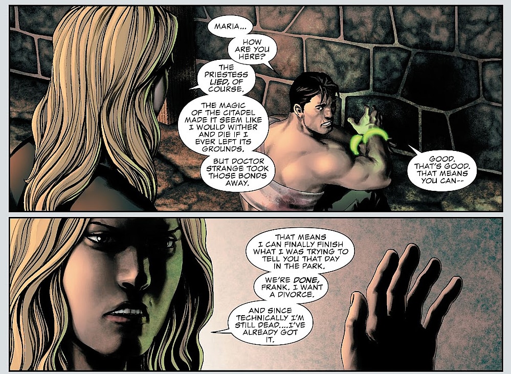 After eschewing Frank Castle’s iconic skull logo and taking away his arsenal of various firearms and explosives, Jason Aaron concluded his 12-issue Punisher series by revealing that his wife Maria intended to divorce him before she and their children were gunned down by mobsters in New York City.