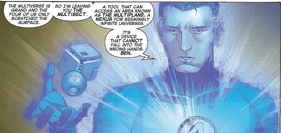 Currently in Chip Zdarsky’s Marvel 2 in 1, Benjamin Grimm aka The Thing and Johnny Storm, aka the Human Torch, are searching for Reed, Sue, and their kids throughout the Multiverse. Doctor Doom delivers a gift to The Thing. It’s a tiny orb with a message from Reed that tells Ben to continue to explore. He even tells him about a device he created called the Multisect that will give him access to the Multiplane and the Marvel Multiverse.