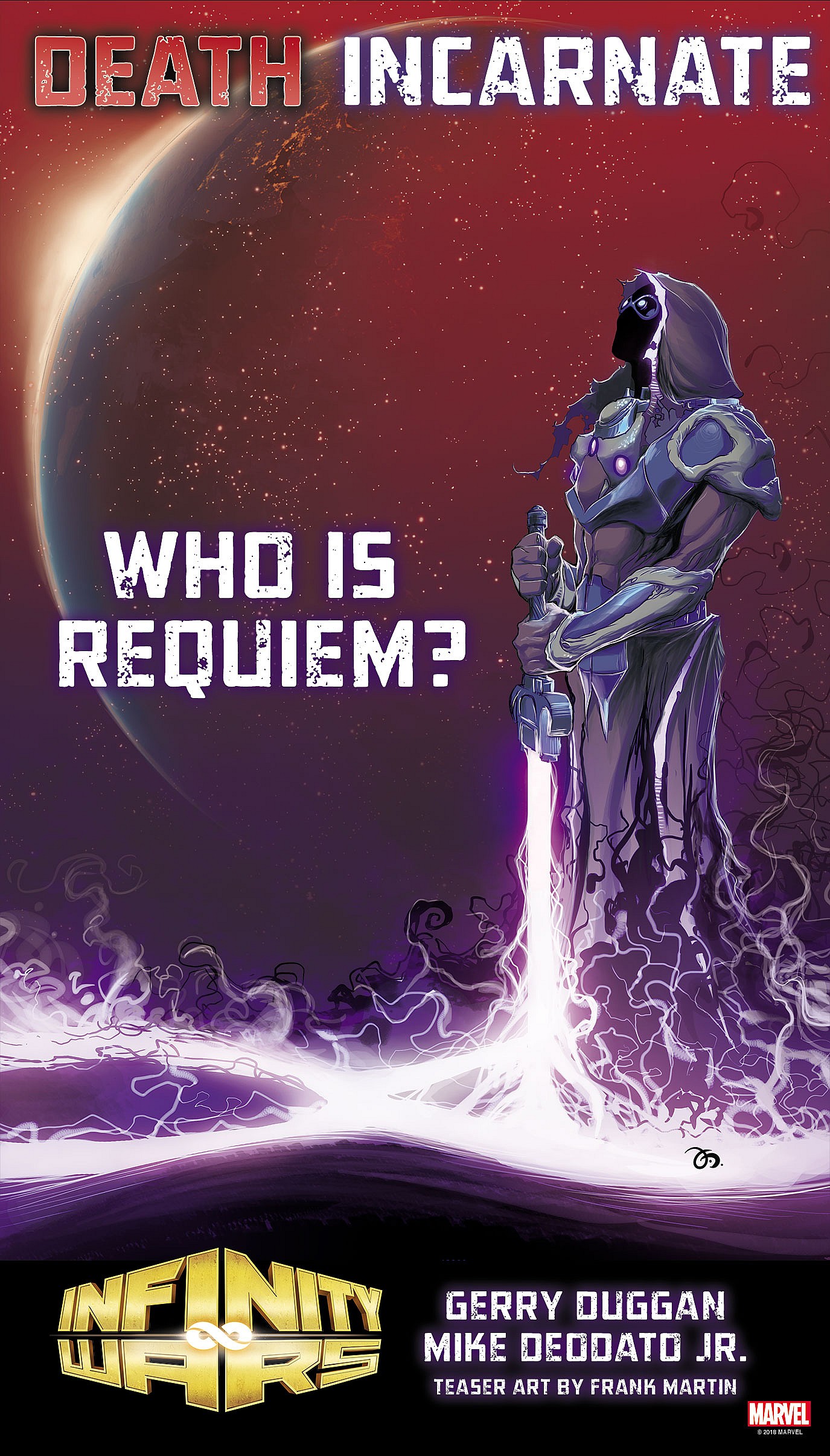 This isn’t the only image, Marvel shared with us concerning their upcoming Summer event. They also sent us another piece of teaser art by Frank Martin which reads Death Incarnate. It then asks the question, “Who is Requiem?”