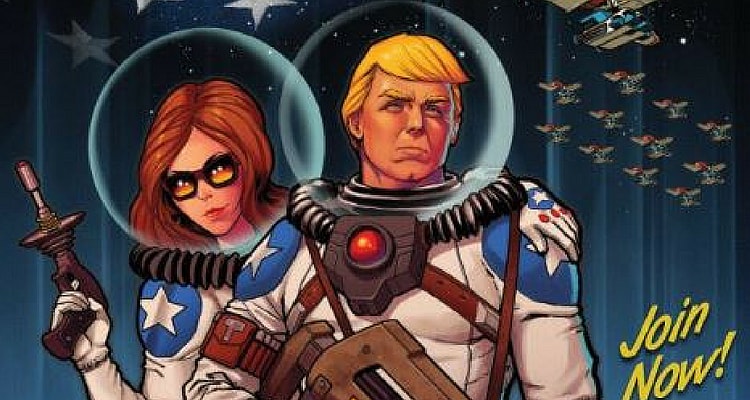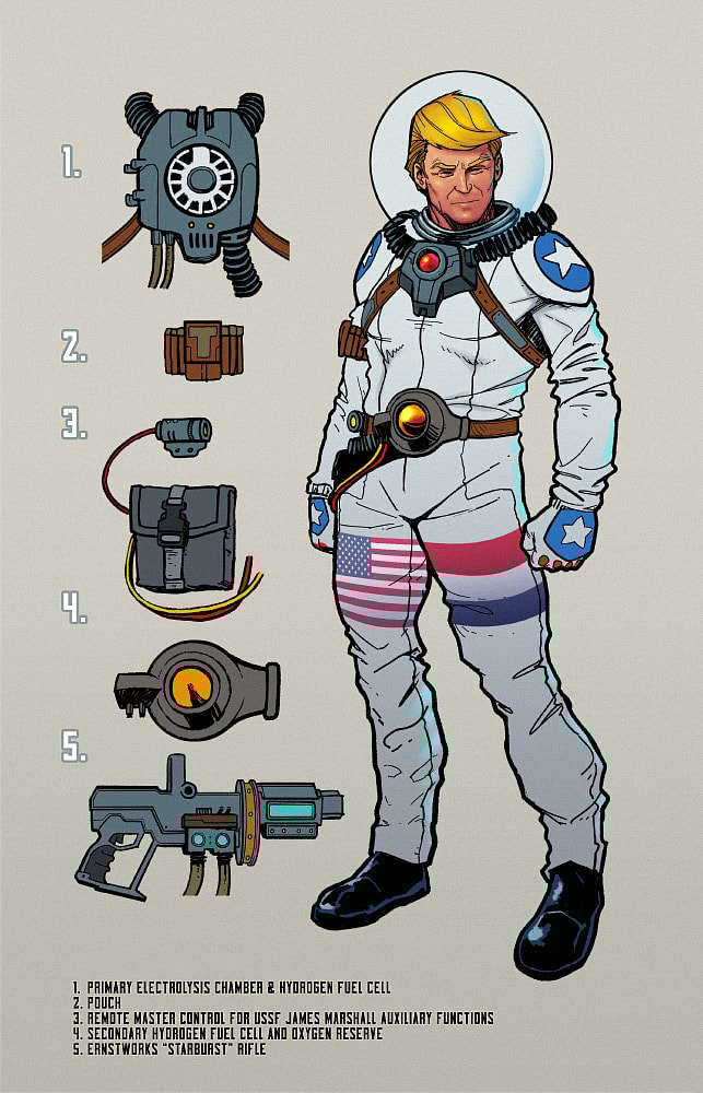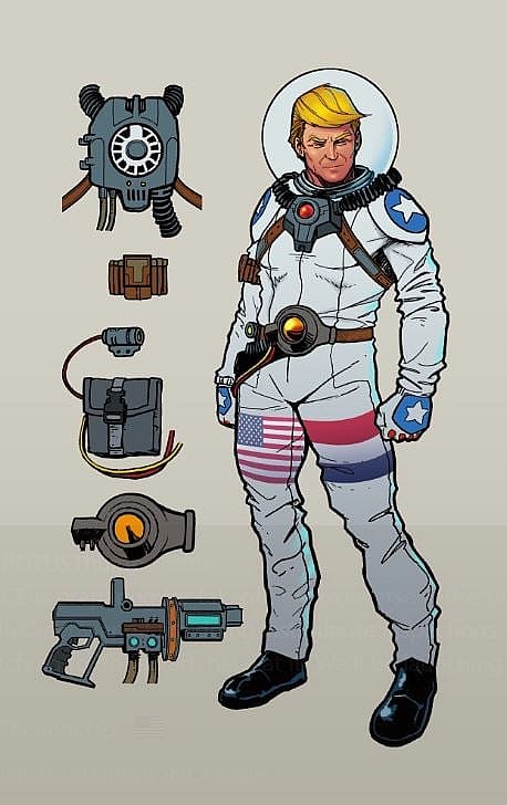 Chuck Dixon, Mark Pellegrini, Timothy Lim, and Brett R. Smith are hard at work for their upcoming new book, Trump’s Space Force. Lim has already revealed the design for Space Force One, and he just recently unveiled Donald Trump’s new Space Force suit.