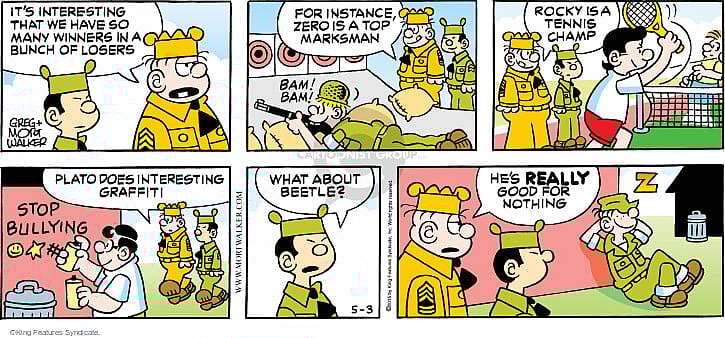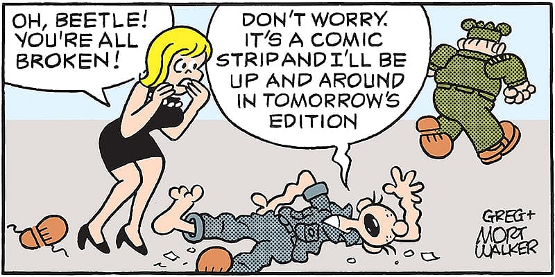 The strip first saw Beetle enlist during the Korean War. However, Walker had him return home due to concerns about the long-term sustainability of an army strip. But due to reader demand, he reenlisted and remains a private to this day!