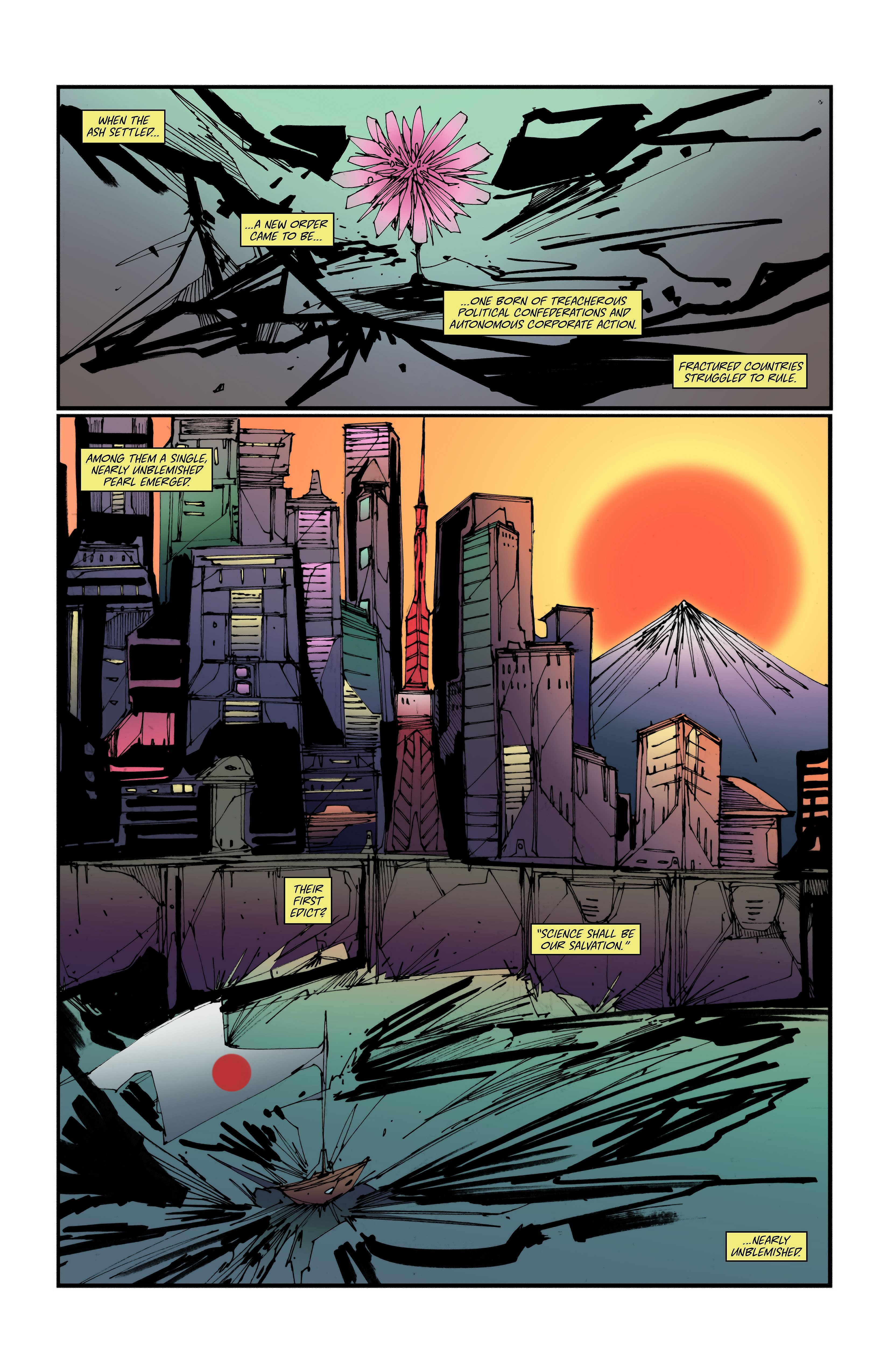 Scrimshaw is a new comic series that tells the story of a future world that has been affected by global warming, genetic and agricultural manipulation, and an all-out war between the superpowers of the world. This genre-mixing tale follows Hans and his crew as they make their way through the New Pacific. The crew members come from every corner of the world and each has their own colorful past. They have to come together as a family to find their way and face an uncertain future.