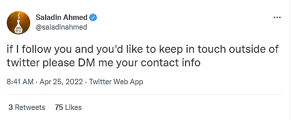 Current Ms. Marvel writer Saladin Ahmed tweeted, “If I follow you and you’d like to keep in touch outside of twitter please DM me your contact info.”
