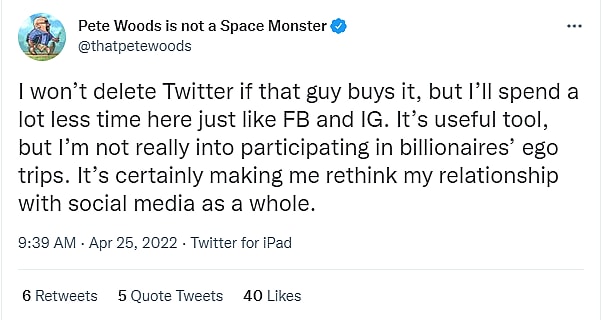 Woods then unironically added, “It’s useful tool, but I’m not really into participating in billionaires’ ego trips. It’s certainly making me rethink my relationship with social media as a whole.”