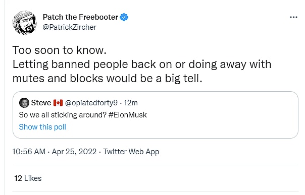Zircher followed that tweet up adding, “Can’t imagine this place working without mutes and blocks. I think that would tank it. I doubt he’d get rid of those. Letting banned people back on would not surprise me.”