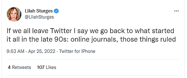 Matthew Sturges, who now calls himself Lilah Sturges, and is the writer of the graphic novel adaptation of Denis Villeneuve’s Dune film, tweeted, “If we all leave Twitter I say we go back to what started it all in the late 90s: online journals, those things ruled.”