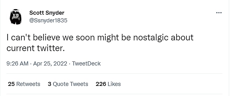 Long-time Batman writer Scott Snyder wrote, “I can’t believe we soon might be nostalgic about current twitter.”