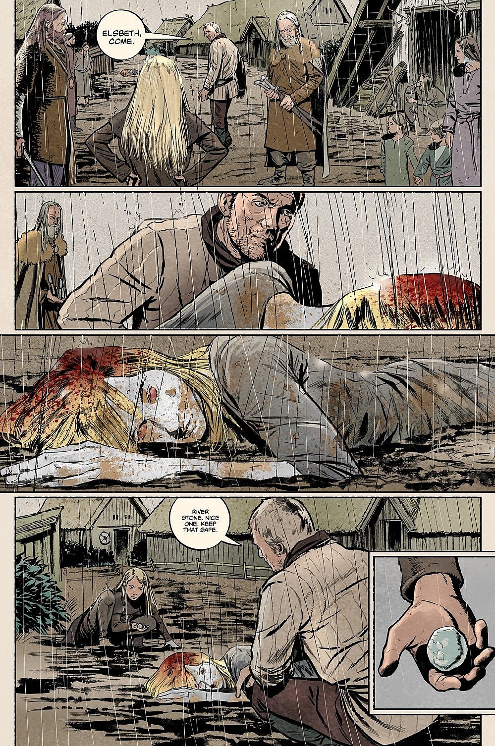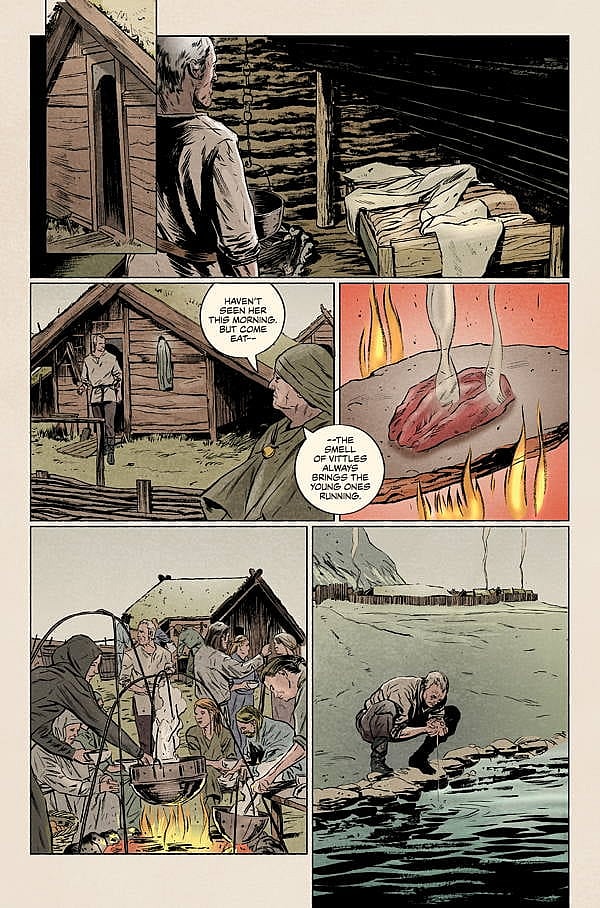 The story in this second issue of Sword Daughter is far more self contained than the first issue. While issue #1 introduced us to the major player and outlined the villains, the plight, and the motives, issue #2 sets that narrative aside in favor of Dag and Elsbeth traveling to an island and eventually getting caught up in the island’s inhabitants’ troubles with a serial killer. Now, granted, the overarching storyline hasn’t been completely ignored as the stopover on the island took place en route to find the main villains of the piece, but the story itself is almost entirely self-contained. I actually enjoyed this narrative choice as it reminded me of a “Monster of the Week” episode of the X-Files as in there is still an over-arching narrative taking place, but there are plenty of independent stories to tell on the way. It’s also nice to see Dag go out of his way to help people he doesn’t know and it helps to flesh out his character a bit and showcase both his and his daughter’s willingness to assist those in need.