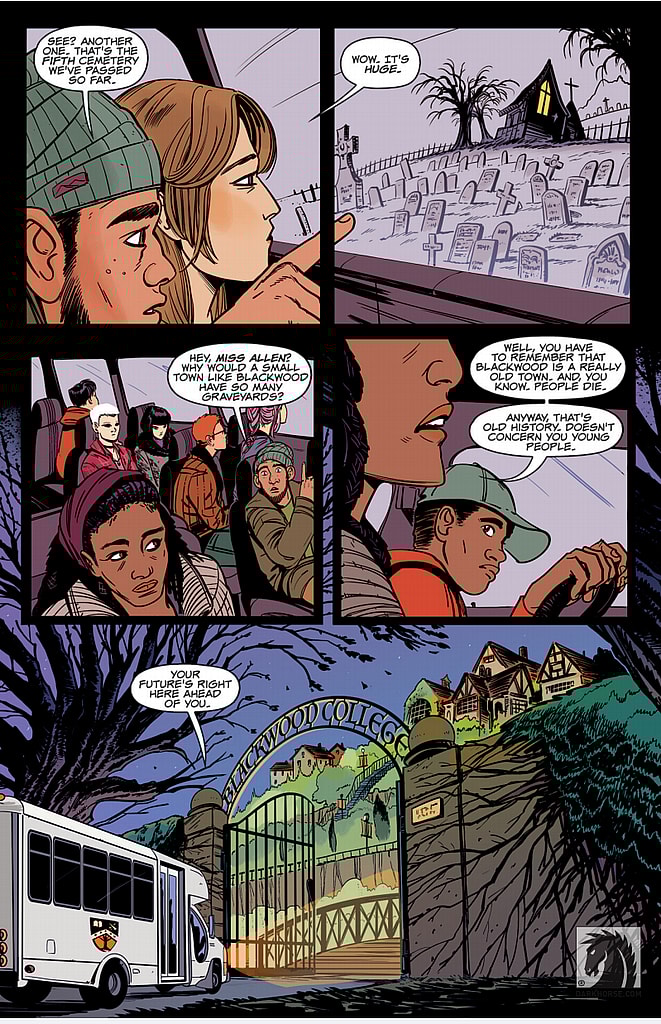 None of the characters seem to know each other yet, and that lends to the overall feeling of mystery and uncertainty that permeates the entire story. Who are these people? Why were they accepted to this college? Why do they pass by so many cemeteries on the way to the school? These are questions that neither the characters, nor us, the readers, are given the answers to yet and it’s lingering questions like these that are going to give this 4-issue series the legs it needs to keep the reader engaged.