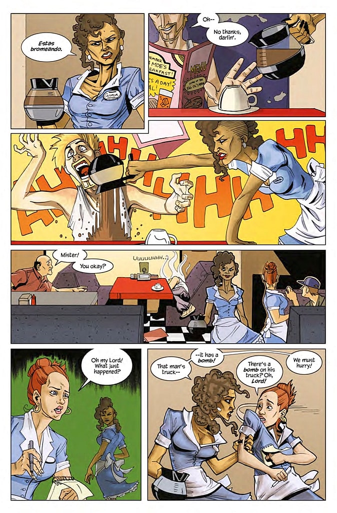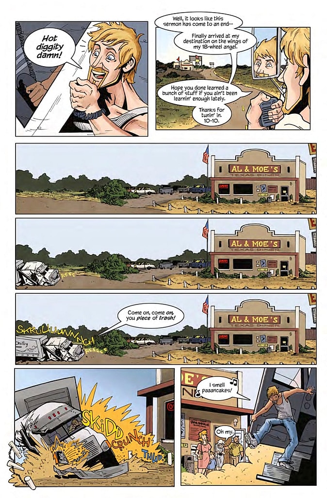 Nash is on the road again following the deadly encounter that he and Billie faced at the end of the last issue. They manage to rendezvous with fellow trucker (and surprisingly, a Shaman) Ray at a diner out in the middle of nowhere named the Al and Moe’s Diner. Get it? Al and Moe’s? Alamo? The story takes place in Texas. It’s a pun. It’s funny. They are, of course, followed by the supremely weird insect-type monster people and a large chunk of the story revolves around our heroes fighting the hordes off throughout the night while stranded at the diner. It evokes the nostalgia that stems from those classic horror movies like Dawn of the Dead or Dog Soldiers with our characters finding themselves holed up in one location while the horrors around them continue to close in.