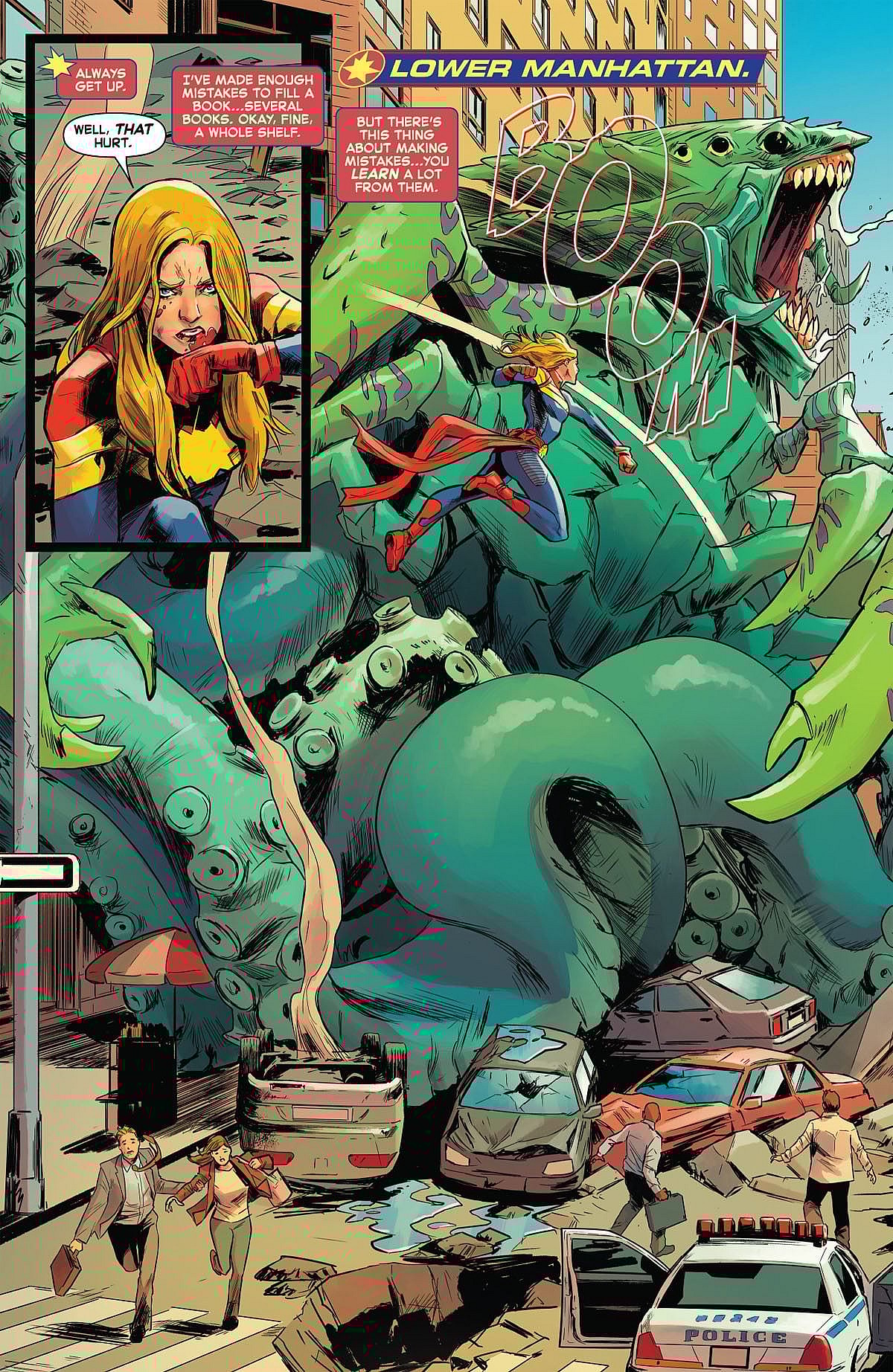 Writer Kelly Thompson has a tendency to take a few issues to hit her stride and this series looks like it will probably follow suit. Thompson does a great job with the first half of the story. She picks you up right in the middle of the action as a giant Kaiju is kicking the crap out of Spider-Woman and downtown Manhattan, not necessarily in that order. Spider-Woman and Captain Marvel are long established besties and Thompson lays down some excellent witty banter while they take care of business. The best part of this opening scene is Thompson’s attention to detail. Thompson writes Spider-Woman just how Bendis wrote her and her voice is distinctly different from Captain Marvel’s. The Kaiju isn’t really a big threat to Captain Marvel, but Spider-Woman is outmatched, and Thompson has fun with this to the point that they even do a variation on “Let me hold him for you while you get your licks in.” The part I’ve been waiting for though comes towards the end of the fight where the Kaiju grabs a little kid and swallows it whole. Captain Marvel follows the child into the monster’s open maw without hesitation and completes the rescue while at the same time ending the threat. It’s a heroic act that we haven’t seen from Carol Danvers in quite some time.