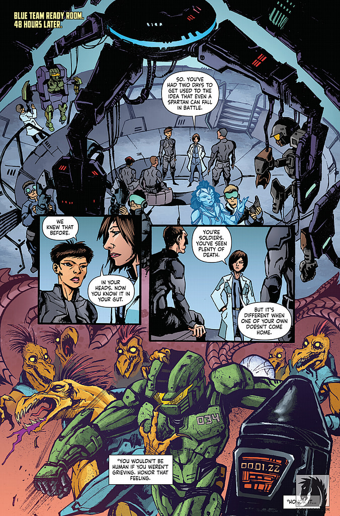 That complaint isn’t simply relegated to Master Chief, unfortunately. Not a whole lot of excitement takes place here. There is a lot of talk about action going on in the panels; we see people remembering interesting things and discussing action-packed goings-on, but we hardly get to witness any of it happen in real time. Picking up a Halo title should carry with it some expectations of action scenes and alien blasting, but anyone looking forward to that will probably find themselves disappointed. Like I said, there’s a lot of talk about stuff like this, but there’s very little of it actually going on. I understand that the first issue of a limited series needs to lay the groundwork and fill us in with exposition, but we get too much of it here and for what it’s worth, all the world-building doesn’t do a great job of explaining much to the reader anyway.