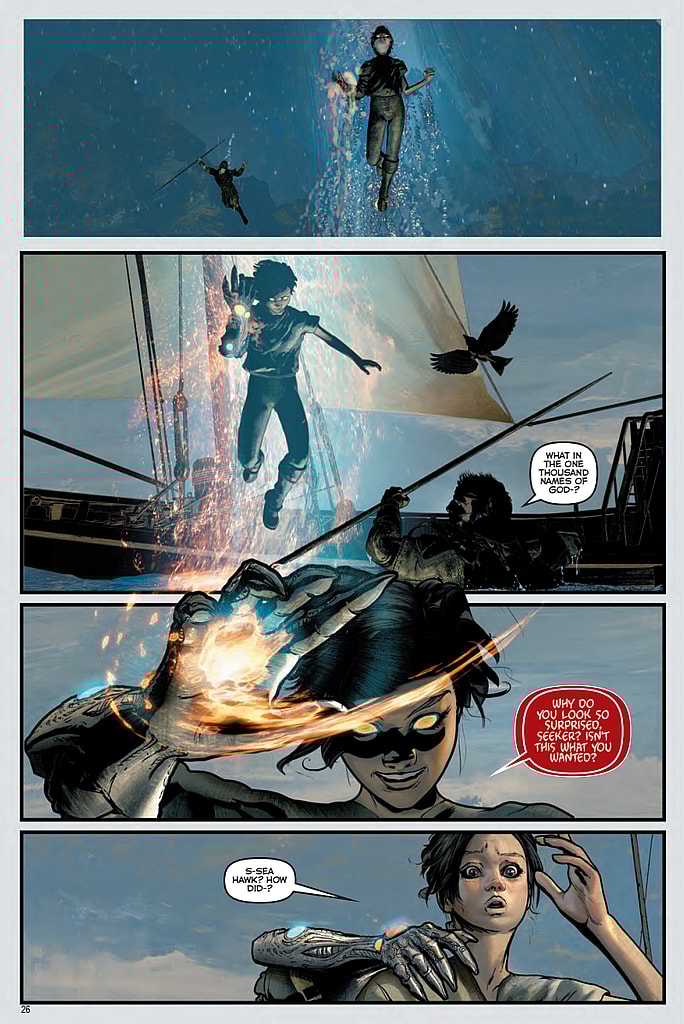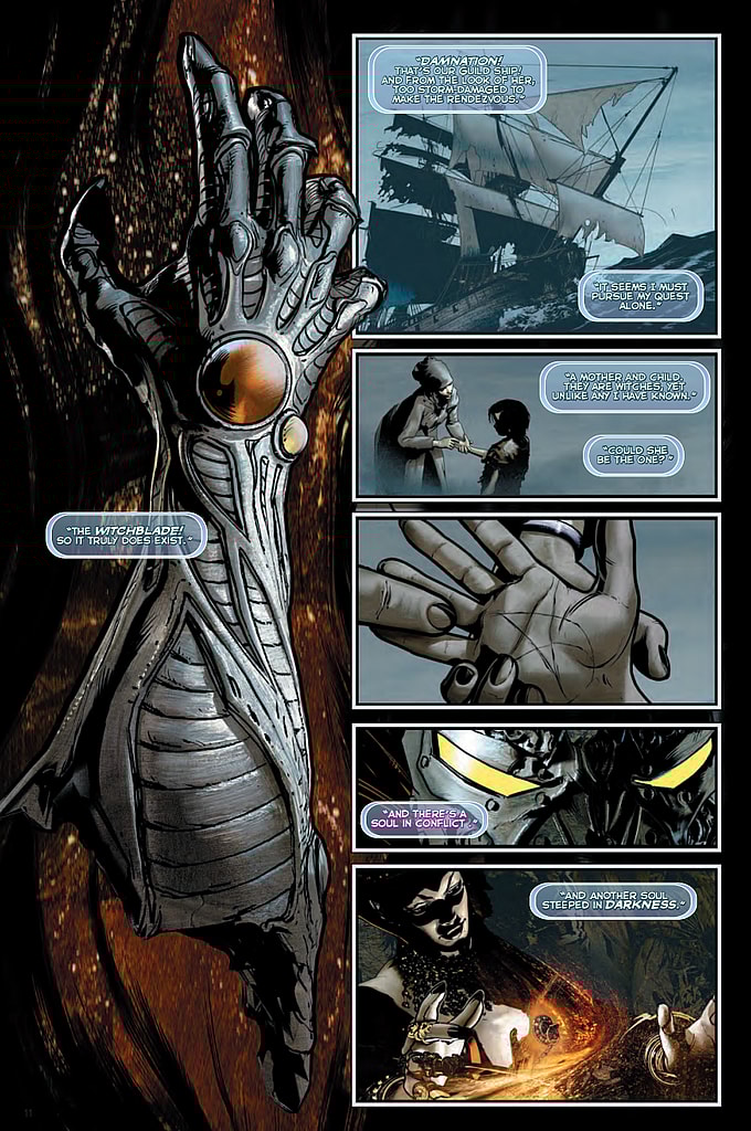 We get a good look at the start of the story at how the Witchblade was lost long ago and why no one has located it for so many years. Its new “chosen one” is introduced as a young girl named Starling who lives on her own and steals to feed herself and her companion, a small cardinal. Sort of like Aladdin, except…. not. She is sought out by a blind seeker named Sea Hawk who has unexpected powers and leads her (unwittingly) to the Witchblade. Together they fend off an attack from a sea monster sent by the witch and end the story with the fabled Witchblade in hand, ready to face down the evil permeating the world.