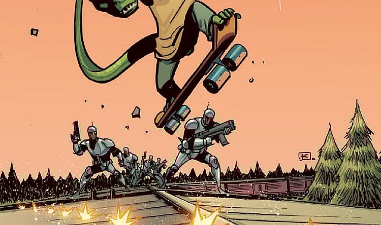 I fell in love with [easyazon_link identifier=”1631403850″ locale=”US” tag=”bounintocomi-20″]Mutanimals[/easyazon_link] for so many reasons because the creative team of Allor and Kuhn just work. They have an understanding of each other and it shines through in every panel. Every emotion on a character’s face that Kuhn illustrates is the perfect match for the script Allor wrote. It’s a perfect match for an outstanding book.