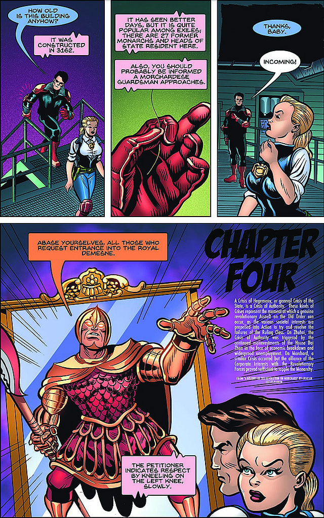 We get to see a lot more of the city and its inhabitants this time around too. One of my biggest complaints with the first issue is that nothing really happened and that the whole issue was basically one long conversation on a street corner. Not so this time around. Our heroes do some traveling about to interview some colorful characters who may or may not end up being antagonists later on in the story. These moments allow us a bigger peek into the wider universe as a whole as well as the residents who inhabit it. It’s clear that real-world issues are influencing some of the writing with there being plenty of undertones of foreign occupation, xenophobia, and political unrest. None of these elements drive the story, however, and they are not heavy handed, which is a nice change of pace when it comes to comic books.