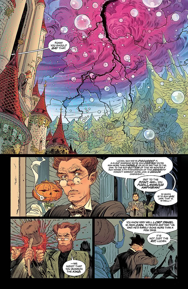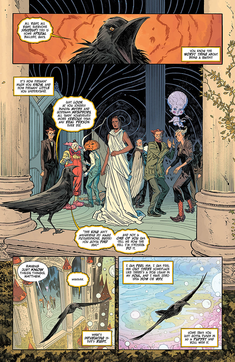 Next up: Lucifer. He’s missing and off on another quest. I’m not going to get into what he’s up to but it’s told to the reader via a raven. A dead one. Apparently Lucifer has been capturing and using ravens to his own ends. I liked the art in this segment a lot. Possibly most of all as it had a creepiness and simplicity to it that reminded me of Marc Hempel’s run in the [easyazon_link identifier=”140123545X” locale=”US” tag=”boundingintocomics-20″]Kindly Ones[/easyazon_link]. I’m not sold on the story but if you’re a Lucifer fan it might be your favorite. I still feel like Lucifer’s tale was done at the end of Season of Mists.