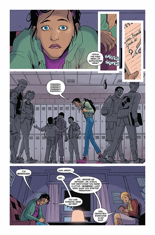 Some lady is flying around the sky. No one knows who she is, or how, or why she’s doing it. Everybody seems to be amused by her antics, but high-schooler Luna is obsessed with them. Luna is our main protagonist of the story and it’s her heart-breaking character arc that carries the first issue. Luna struggles with severe anxiety as well as uncontrollable violent thoughts. She would never hurt a fly, so these images of herself inflicting horrific acts upon people she loves is beginning to break her down and the book doesn’t hold back on the intensity of these scenes. She also struggles constantly with an inner voice that continually berates her and tells her what a terrible person she is. It’s heart breaking stuff.
