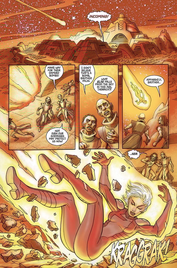 We’re not given a whole lot of exposition to start us out in Stellar’s first issue. We get thrown right into the middle of what is obviously a war-torn landscape and we’re instantly introduced to a universe that is immediately interesting, even though we know very little about it. The landscape is littered with carcasses belonging to all sort of creatures both great with none of them easily identifiable. This is obviously an aggressively sci-fi world and it’s good to see the writers and artists going all in from the very first panel.