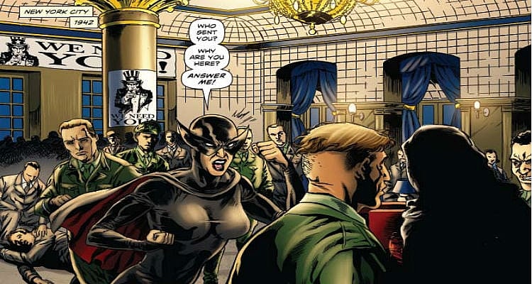 Then, suddenly, Miss Fury is able to leap through the door. It is unclear how, because previously it was mentioned they were unable to pursue the suspected assassins. Somehow, the two women believe each other to be the perpetrator of their respective dimension’s attempted murders.
