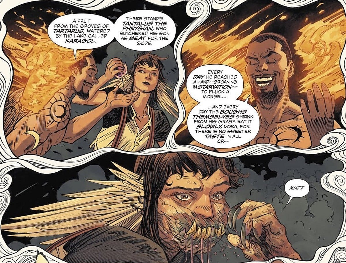 Here’s where we pick up the story. As someone who loves Neil Gaiman’s run on [easyazon_link identifier=”1401225756″ locale=”US” tag=”boundingintocomics-20″]The Sandman[/easyazon_link], I know most of these characters. The DC writers who have used the denizens of the Dreaming have done a good job over the years since Gaiman left at keeping everybody at least true to character. So I was more than a little distressed, even knowing going into this what Simon Spurrier was doing, that the Dreaming was in tatters and everybody was acting out of character. The idea behind [easyazon_link identifier=”B07FMNKNX4″ locale=”US” tag=”boundingintocomics-20″]The Dreaming #1[/easyazon_link] was to completely take apart everything Neil Gaiman left after his exit from his long-running Sandman series and to rebuild it with something new. The series writer Simon Spurrier even received Gaiman’s blessing to do it. It was a very classy move on his part, considering he was under no obligation to ask Gaiman’s permission.