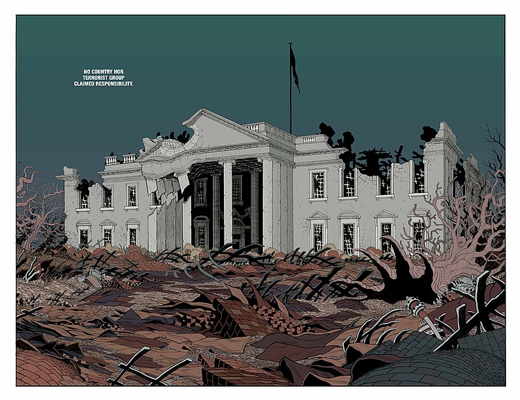 Ales Kot and Tradd Moore’s The New World starts off strong with the tried and true Terminator 2 style opening where the bombs go off and the world, well actually the United States of America is now changed forever. The country is divided into several areas and we’re introduced to New California the setting for our story.