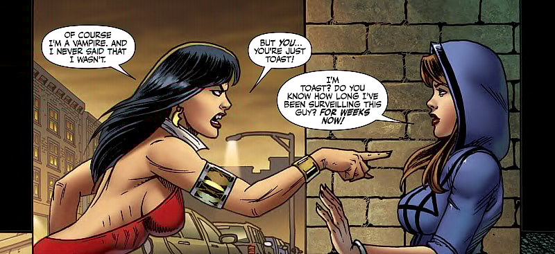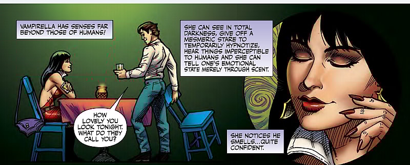 On the plus side, for people who are unfamiliar with Vampirella, this first issue of the new series is a decent jumping on point, even if it is a little unspectacular. Care has been taken to introduce Vampirella to new readers by giving a quick summary of her origins and a rundown of her powers and weaknesses, or lack thereof. It’s done quickly and unobtrusively in a way that gives newcomers all the info they might need without boring longtime fans who have been following Vampirella’s exploit for years.