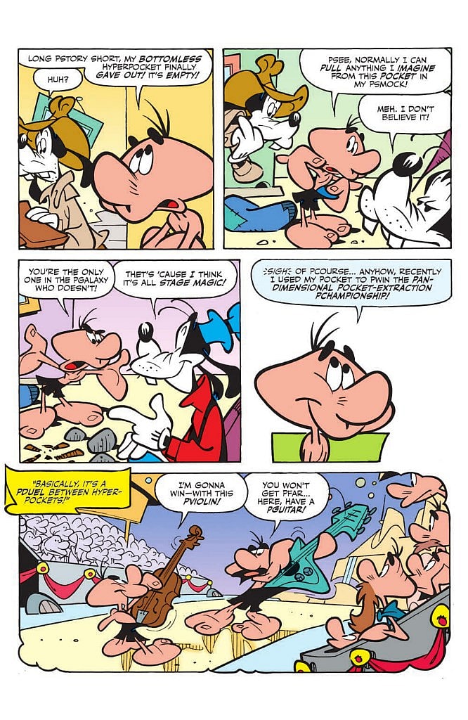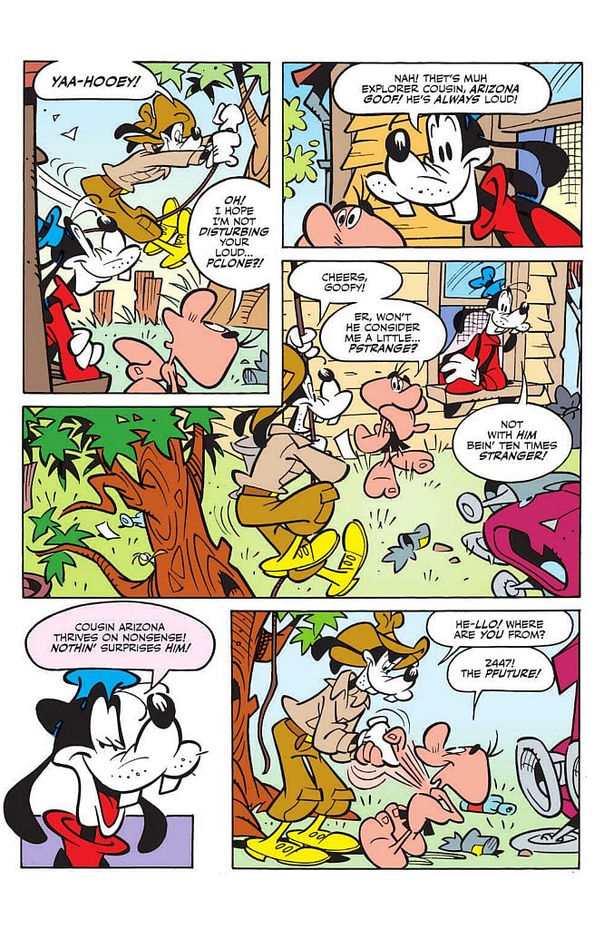 Split into two separate stories originally appearing in Italian comics in 2003 and 2012, both appear in English for the first time ever. Of the two, the second story is easily the better one. Both include Goofy’s ridiculous cousin, Arizona Goof (an obvious riff on Indiana Jones), but the first story focuses almost exclusively on him and a weird alien named Eega Beeva (yeah, I don’t know either) while leaving Goofy himself sidelined for most of the story. I don’t know about you, but when I read a Goofy comic book, I want to read about Goofy, not his annoying cousin of whom I know nothing about. Eega Beeva is not a great character either as he starts every other word with the letter “P” for some reason and it makes reading his dialogue confusing and frustrating. The story itself revolves around Arizona and Eega flying through space in an attempt to figure out what’s wrong with Eega’s pants’ pocket. No kidding; that’s what it’s about.