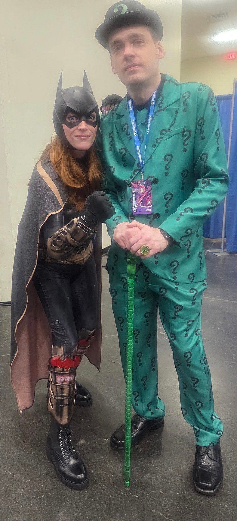 My father-in-law 3D printed all our accessories for Batgirl and Riddler. The question mark ring and the green staff were 3D printed and painted by him while he also 3D printed the utility belt, the shin guards, and the gauntlets for Batgirl. We used to have to order expensive props from Etsy and other random websites that you never knew were legit or not. There were still some issues like glue holding the length of the con and scrambling to locate a pair of scissors at the last minute, but overall, I think we prefer the 3D printing process more especially if you know someone willing to work with you.