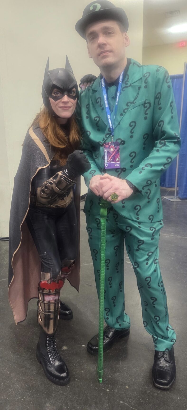 We had a group of friends to coordinate with this year, and the themes were DC characters on Saturday and something cute on Sunday. My wife was Batgirl on Saturday, and I was Riddler, and she was an anime cat girl on Sunday, and I wore a suit, blue wig, and brown cat ears. Comicpalooza typically has the biggest attendance on Saturdays, so we usually plan our biggest and best costumes for that day with Sundays being something a bit more comfortable. The doors don’t open until 2 pm on Fridays, so we either don’t dress up or do our easiest costumes then.