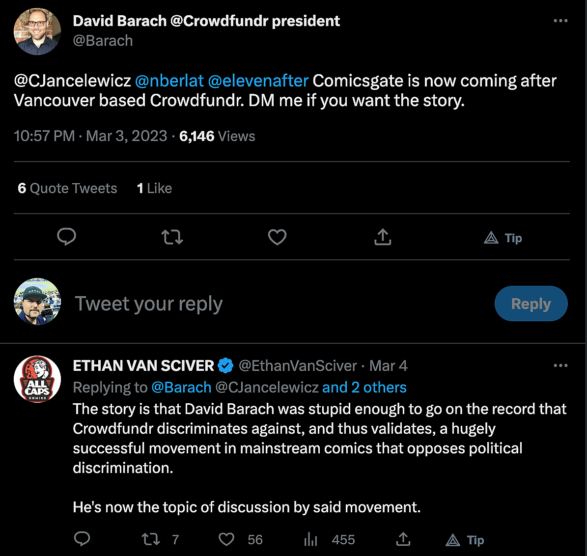Ethan Van Sciver, creator of Cyberfrog and owner of the ComicsGate trademark, replied to the tweet with an accurate description of what’s going on, saying, “The story is that David Barach was stupid enough to go on the record that Crowdfundr discriminates against, and thus validates, a hugely successful movement in mainstream comics that opposes political discrimination. He’s now the topic of discussion by said movement.”