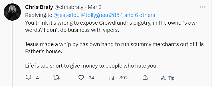 Braly and others have taken to Twitter to vocalize their distaste for Crowdfundr’s cancel culture. He echoed a sentiment of many conservatives who have been burned by major corporations through the arts by stating “life is too short to give money to people who hate you.”