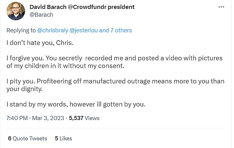 Barach, however, decided to play victim, replying to the Tweet: “I don’t hate you, Chris. I forgive you. You secretly recorded me and posted a video with pictures of my children in it without my consent. I pity you. Profiteering off manufactured outrage means more to you than your dignity. I stand by my words, however ill gotten by you.”
