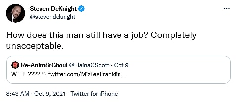 Taking notice of Franklin’s tweet thanks to Digital Domain Senior Animator Elaina Scott’s reaction to the story, DeKnight replied to the revelation asking “How does this man still have a job? Completely unacceptable.”
