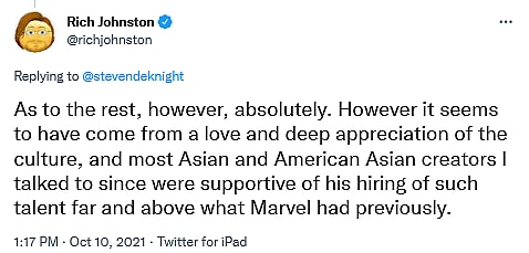 In one of the most disingenuous and socially partisan deflections of all time, Johnston further attempted to excuse Cebulski’s deception as having “come from a love and deep appreciation of the culture, and most Asian and American Asian creators I talked to since were supportive of his hiring of such talent far and above what Marvel had previously.”