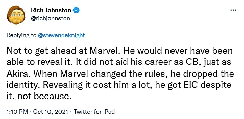 “He would never have been able to reveal it,” said Johnston. “It did not aid his career as CB, just as Akira. When Marvel changed the rules, he dropped the identity. Revealing it cost him a lot, he got EIC despite it, not because.”