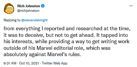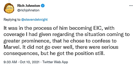 “It was in the process of him becoming EIC, with coverage I had given regarding the situation coming to greater prominence, that he chose to confess to Marvel,” argued Johnston. “It did not go over well, there were serious consequences, but he got the position still.”