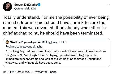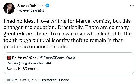 In discussion with another fan who stated they were “trying, operative word, to get past the immediate pungent aroma and look at the whole thing to try and understand what was, and what could have been, done,” DeKnight continued, “Totally understand. For me the possibility of ever being named editor-in-chief should have shrunk to zero the moment this was revealed.”