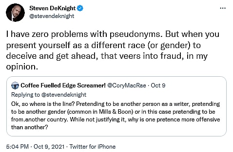 When DeKnight explained that he had “zero problems with pseudonyms” but believed that “when you present yourself as a different race (or gender) to deceive and get ahead, that veers into fraud, in my opinion,” Johnston again ran cover for Cebulski, attempting to split hairs by arguing that “from everything I reported and researched at the time, it was to deceive, but not to get ahead.”