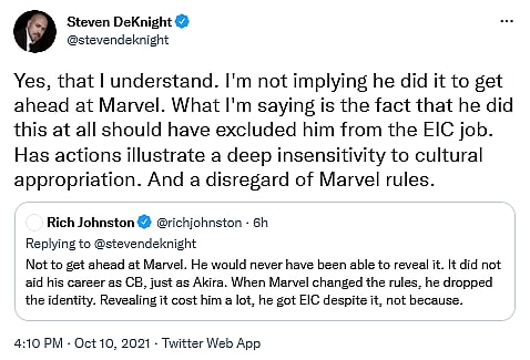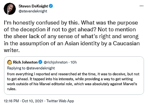 Pushing back on this defense, DeKnight asked Johnston, “What was the purpose of the deception if not to get ahead? Not to mention the sheer lack of any sense of what’s right and wrong in the assumption of an Asian identity by a Caucasian writer,” to which the Bleeding Cool founder, once again disingenuously, argued that Cebulski’s pseudonym was not taken up “to get ahead at Marvel.”