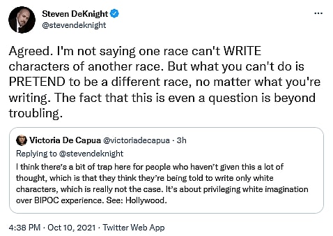 In conclusion to his thoughts, DeKnight clarified that he was “not saying one race can’t WRITE characters of another race,” but rather, “what you can’t do is PRETEND to be a different race, no matter what you’re writing.”