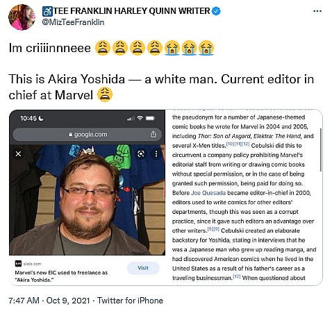 “Im criiiinnneee,” wrote Franklin, bringing up the subject seemingly apropos of nothing. “This is Akira Yoshida — a white man. Current editor in chief at Marvel.”